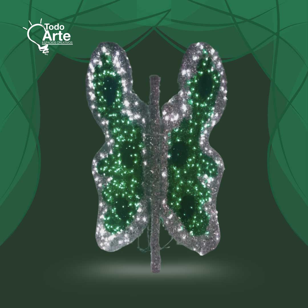 Mariposa luminosa con efectos brillantes verde y plateado, ideal